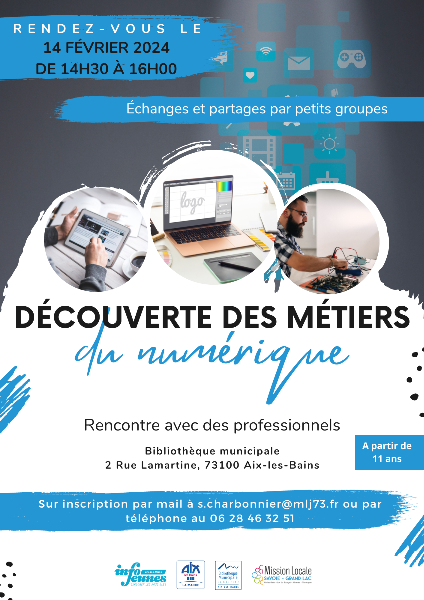 Découvrez les "Métiers du numérique" lors d'un Point Info Jeunesse organisé en partenariat avec la Mission locale Savoie - Grand Lac, de 14h30 à 16h, sous la forme d'échanges et de partages par petits groupes. Différents métiers seront représentés.